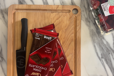 3. Move your bowl of strawberries to the side and cut up your chocolate to prepare to melt.