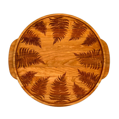 Laura Zindel is an illustrator and potter from Brattleboro, Vermont. Her artwork celebrates the beauty of the natural world. The Cherry Round Tray has been engraved with a beautiful ring of ferns. The piece is a delightful way to serve drinks, dessert or even for displaying candles.
