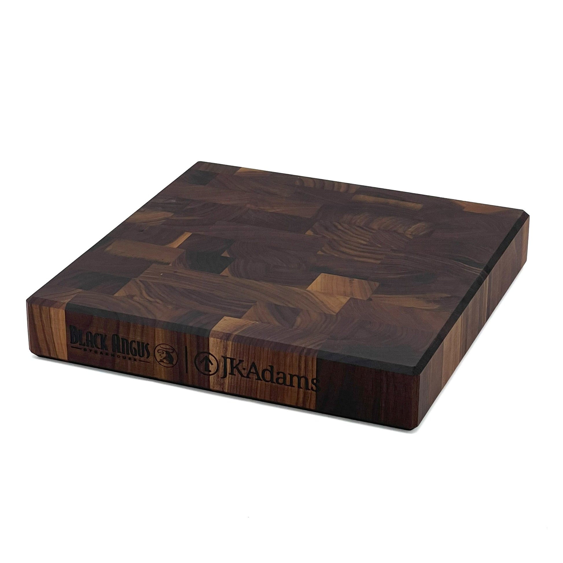 The Black Angus Walnut End Grain Cutting Board, 12"x 12", recreates a chef's favorite for the home cook. The board has been branded with the Black Angus and JK Adams logo on the side of the board. An end grain cutting board's surface is made up of the densest part of the wood that will not dull your knives' edge. This board is great for the prep work of chopping, dicing and mincing. Bring the chef's tools home and recreate the Black Angus Steakhouse line to your own kitchen.