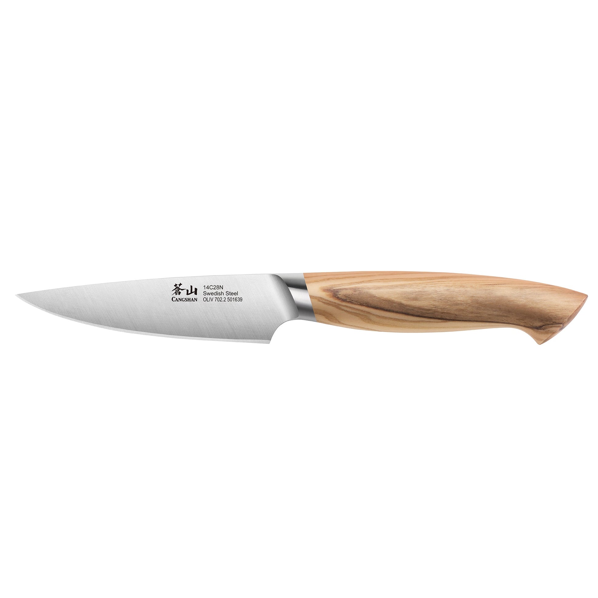 The 3.5 inch Paring Knife is a kitchen essential. The small blade is designed for the ever day tasks of peeling fruits and vegetables, mincing garlic or chopping herbs. The handle is made of Olive wood with the beauty of the natural wood grain. The handle is ergonomically designed for optimum comfort.