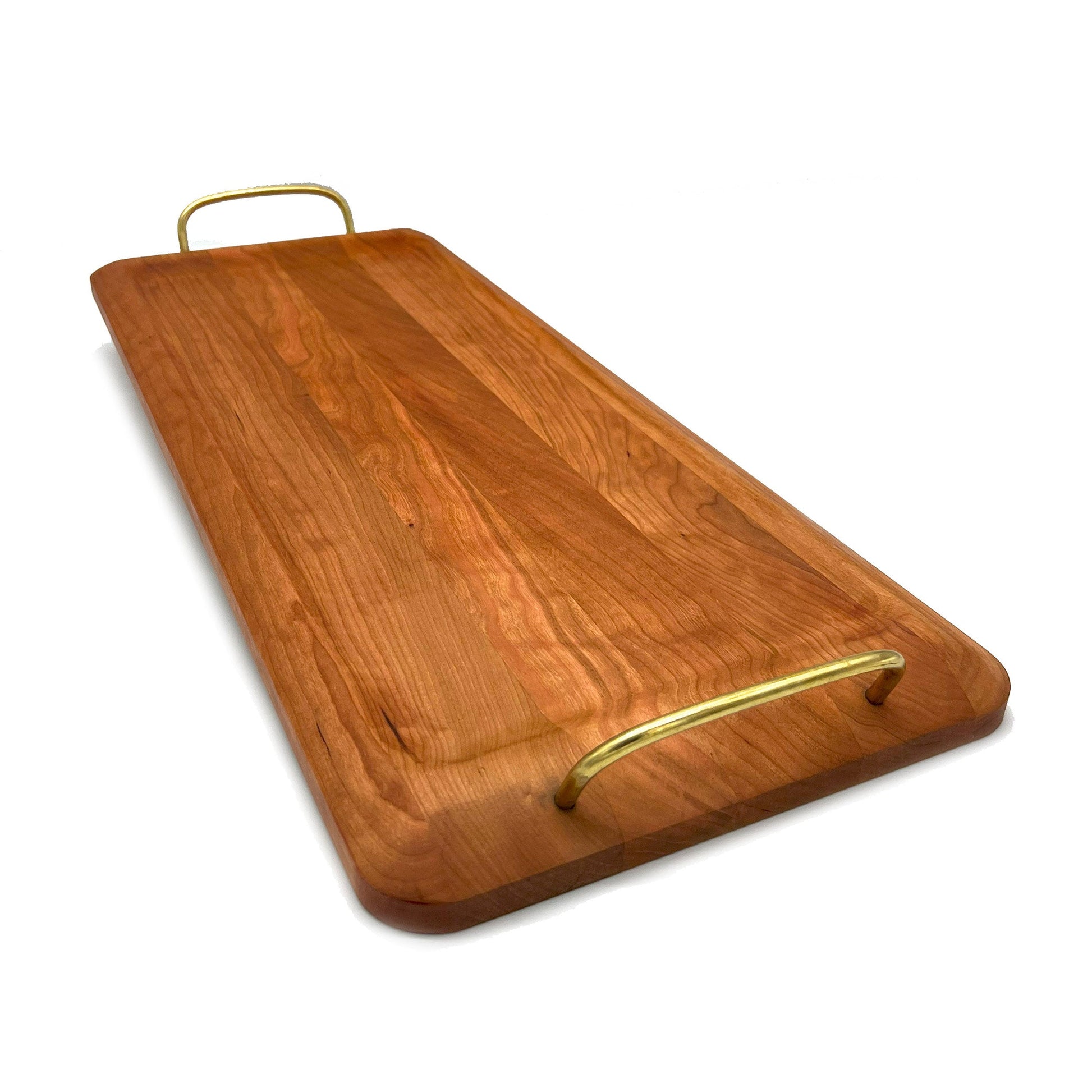 Crafted from beautiful cherry wood, this 24" x 10" serving board is the perfect addition to any kitchen. Its sturdy brass handles provide a touch of elegance while making it easy to carry and maneuver. Impress your guests and elevate your serving game with this stunning cherry serving board.