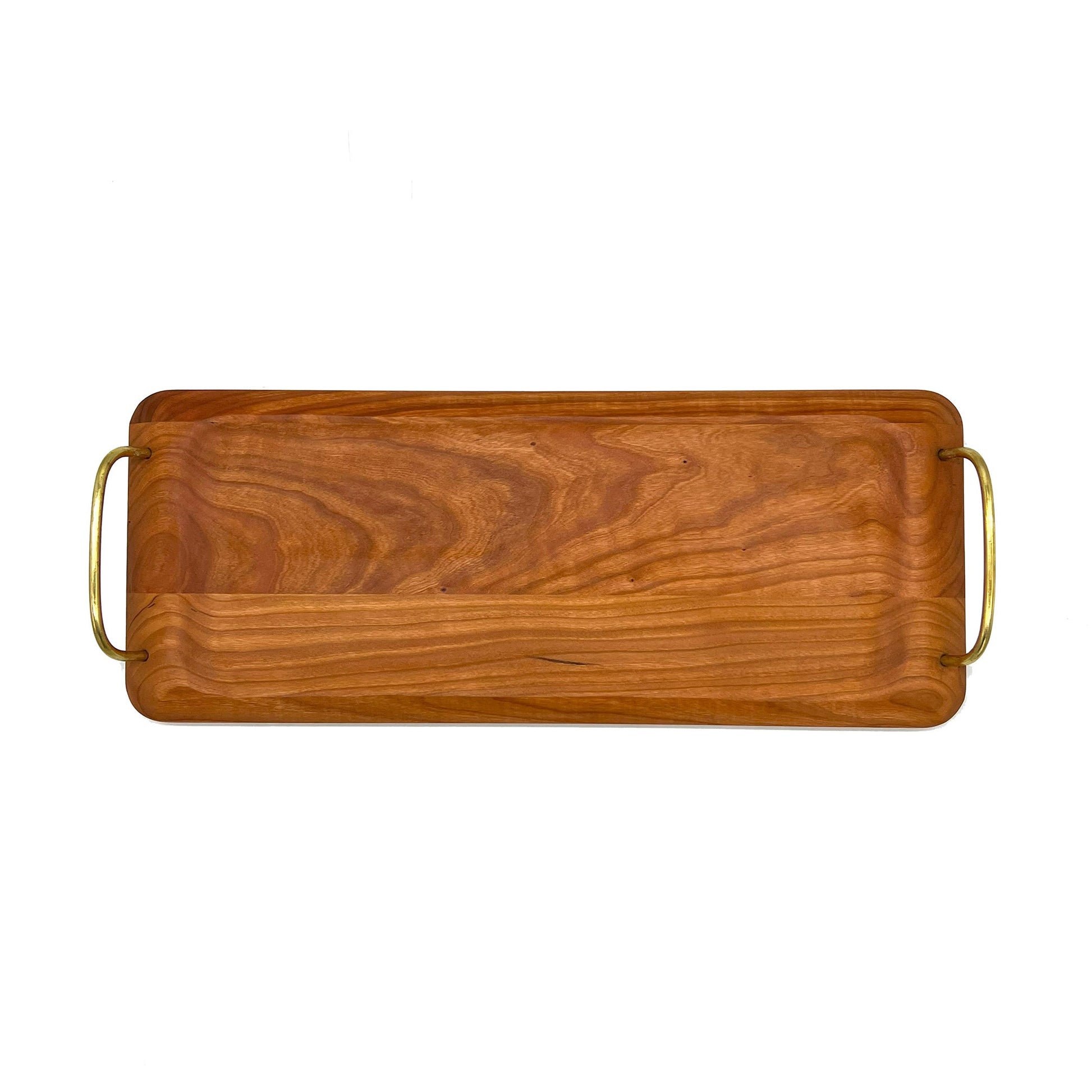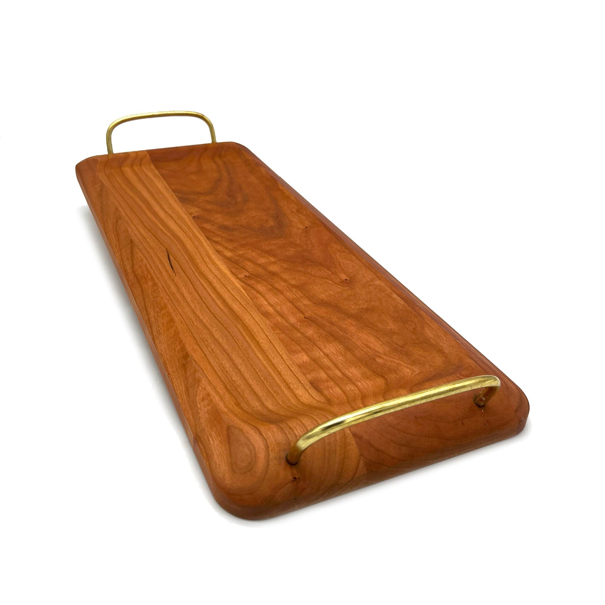 Crafted from smooth and durable cherry wood, this 20" x 8" serving board features elegant brass handles for easy serving. Its long, thin shape allows for versatile use, making it perfect for serving appetizers, cheese platters, and more. Elevate your hosting game with this stylish and functional serving board.
