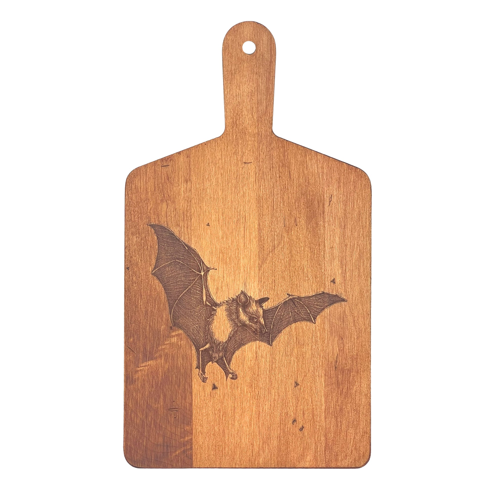 Our Artisan Maple Rectangle Handled Cheese Board is a smaller sized board that is great for serving a couple of people or highlighting a singular cheese. The engraving is of a bat. The illustration is from Vermont Artist, Laura Zindel. A unique gift for a loved one.