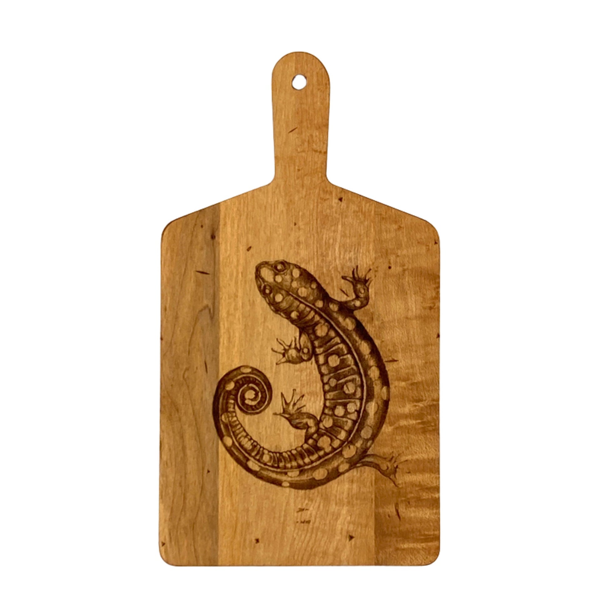 Our Artisan Maple Rectangle Handled Cheese Board is a smaller sized board that is great for serving a couple of people or highlighting a singular cheese. The engraving is of spotted salamander. The artwork is from Vermont Artist, Laura Zindel. A unique gift for a loved one.