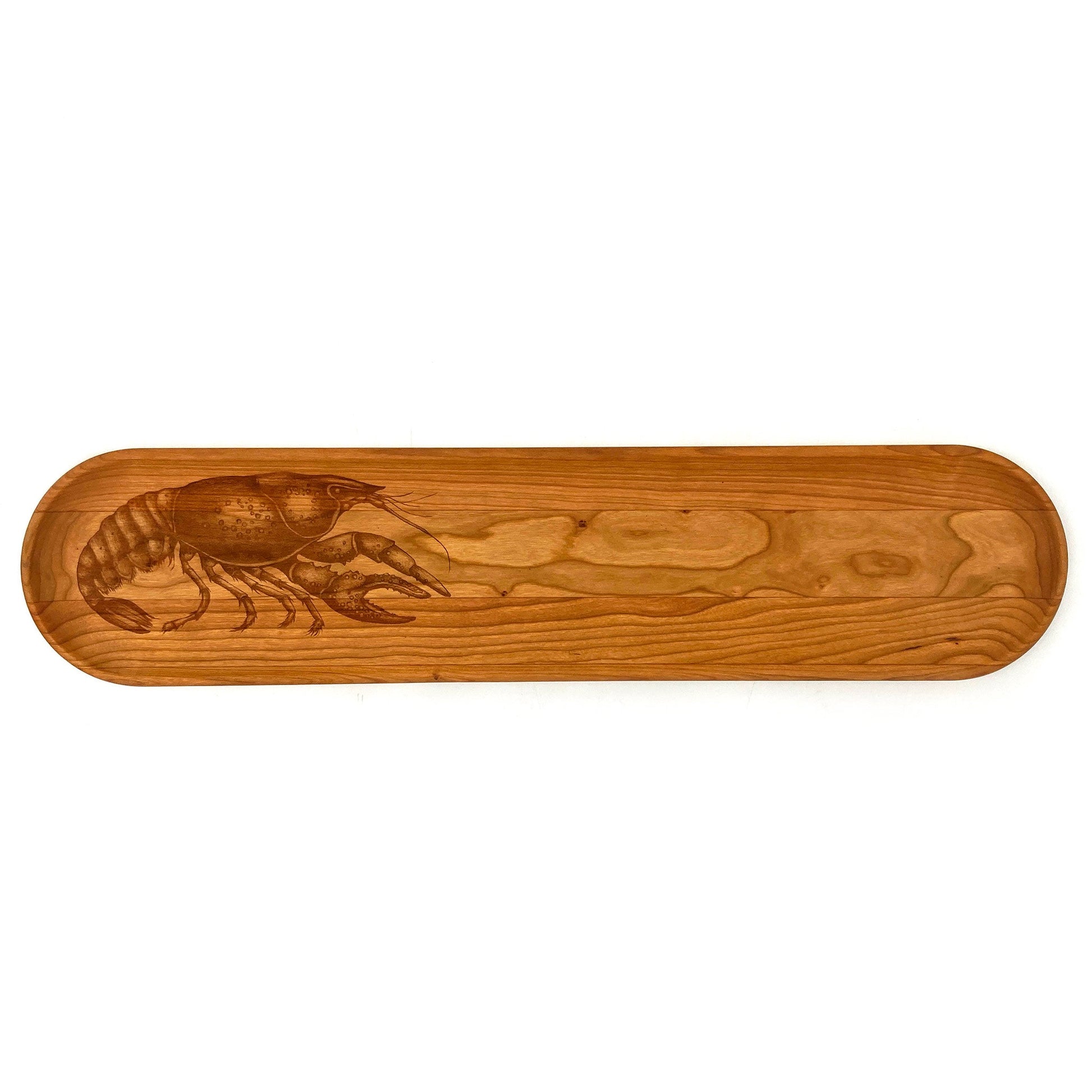 The Laura Zindel Cherry Appetizer Trays have been engraved with the nautical illustrations of a nautilus, crawfish or a hermit crab. A sweet piece for serving a ramekin or melted butter and placing shells. The artwork is from Vermont own's Laura Zindel. Wood grain and color will vary in each board.