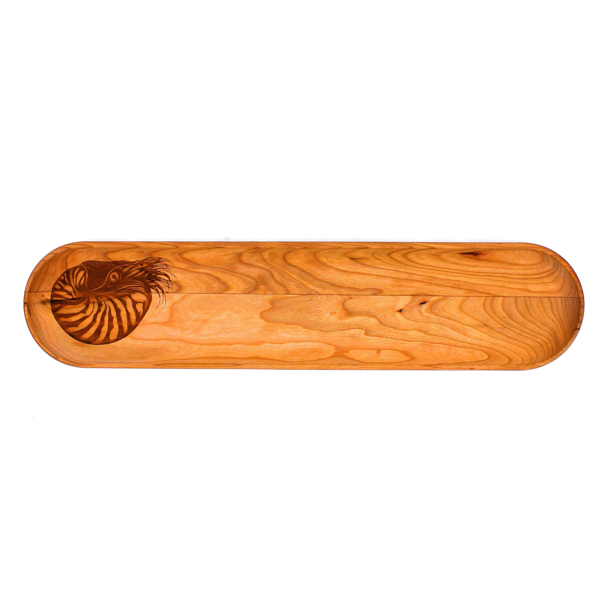 The Laura Zindel Cherry Appetizer Trays have been engraved with the nautical illustrations of a nautilus, crawfish or a hermit crab. A sweet piece for serving a ramekin or melted butter and placing shells. The artwork is from Vermont own's Laura Zindel. Wood grain and color will vary in each board.