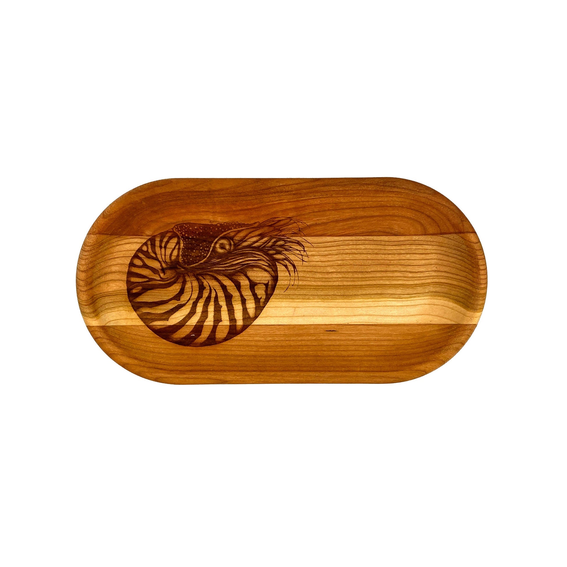 The Laura Zindel Cherry Appetizer Trays have been engraved with the nautical illustrations of a nautilus, crawfish or a hermit crab. A sweet piece for serving appetizers, placing seafood picks or even as a small valet tray for jewelry and keys.