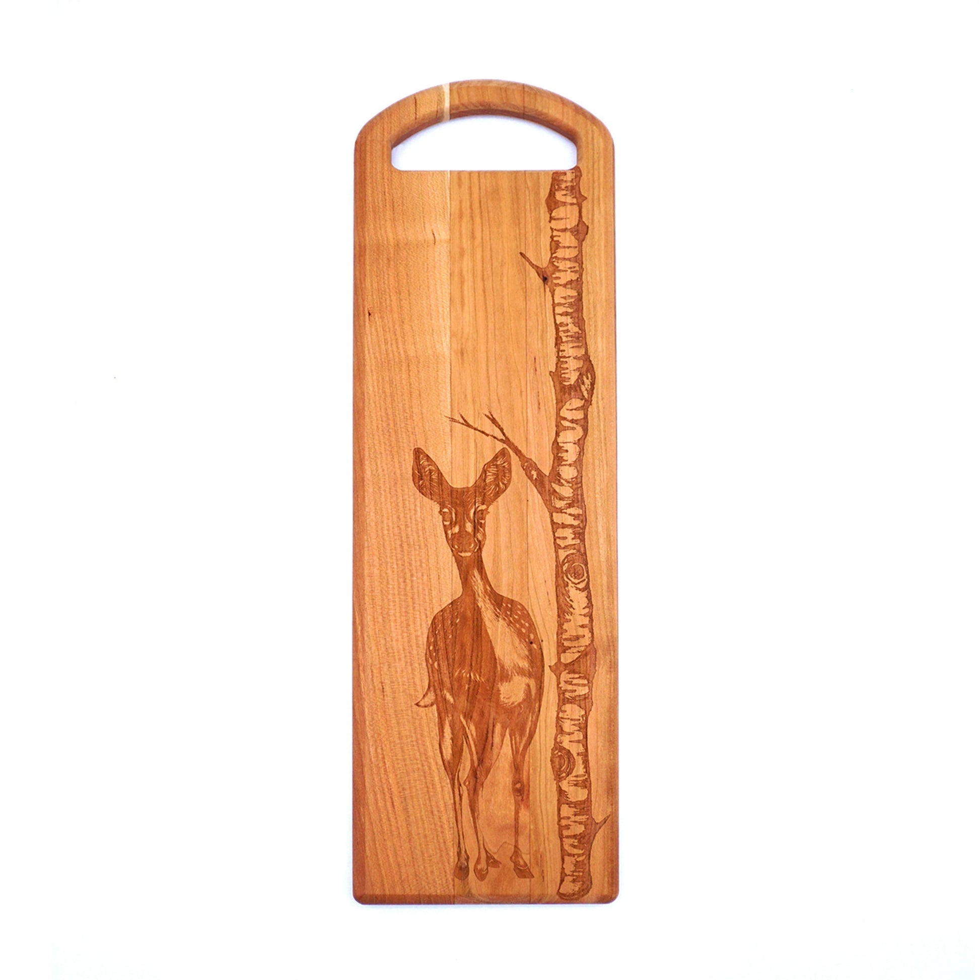 Our Cherry Bread Board has been engraved with a variety of illustrations from Vermont artist, Laura Zindel. This boards long narrow shape makes it the ideal size for serving baguettes, bruschetta or crostini.