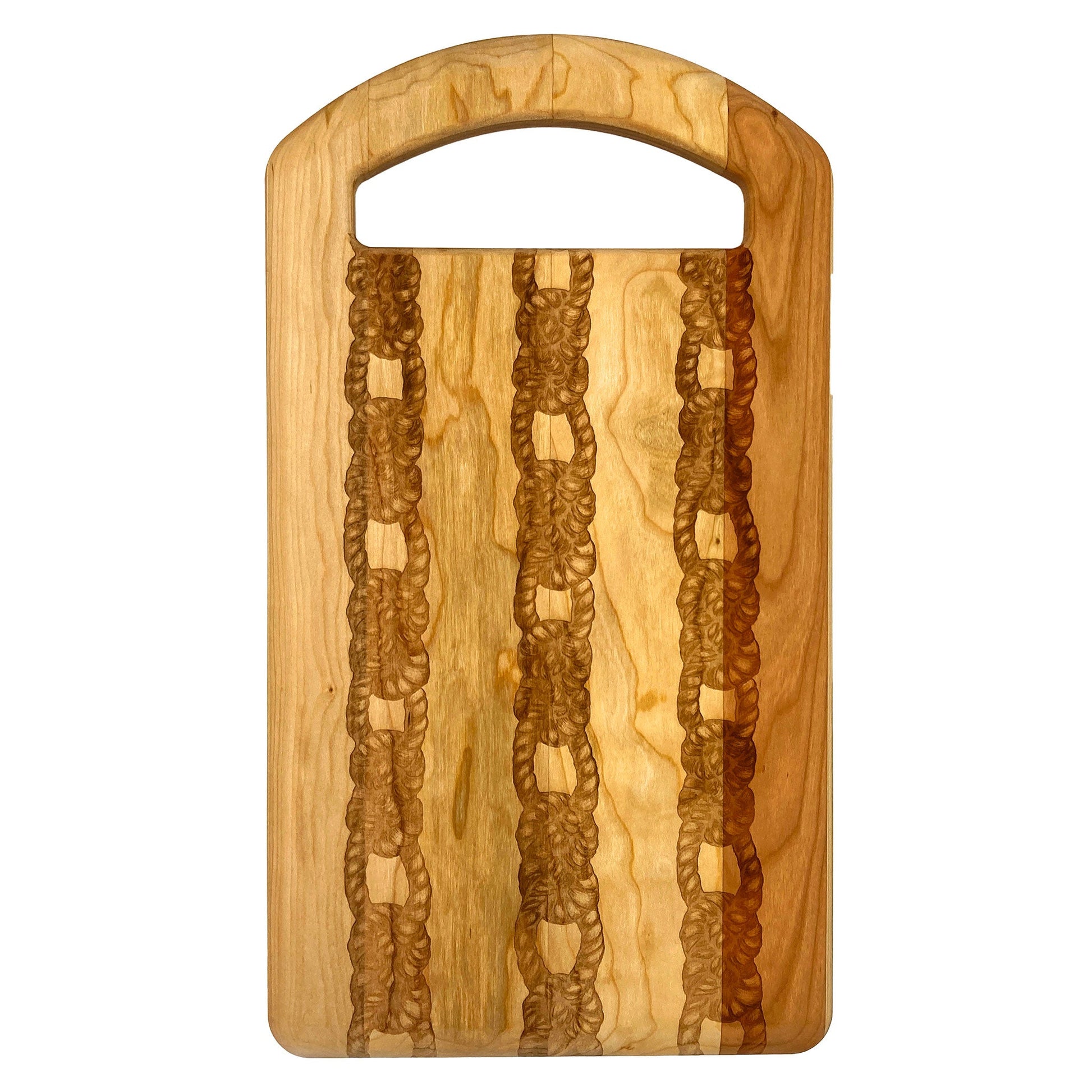 The Laura Zindel Cherry Large Serving Board with oval handle is a gorgeous serving board for your next party. The board has been engraved with ropes from the artwork of Vermont Artisan Laura Zindel.