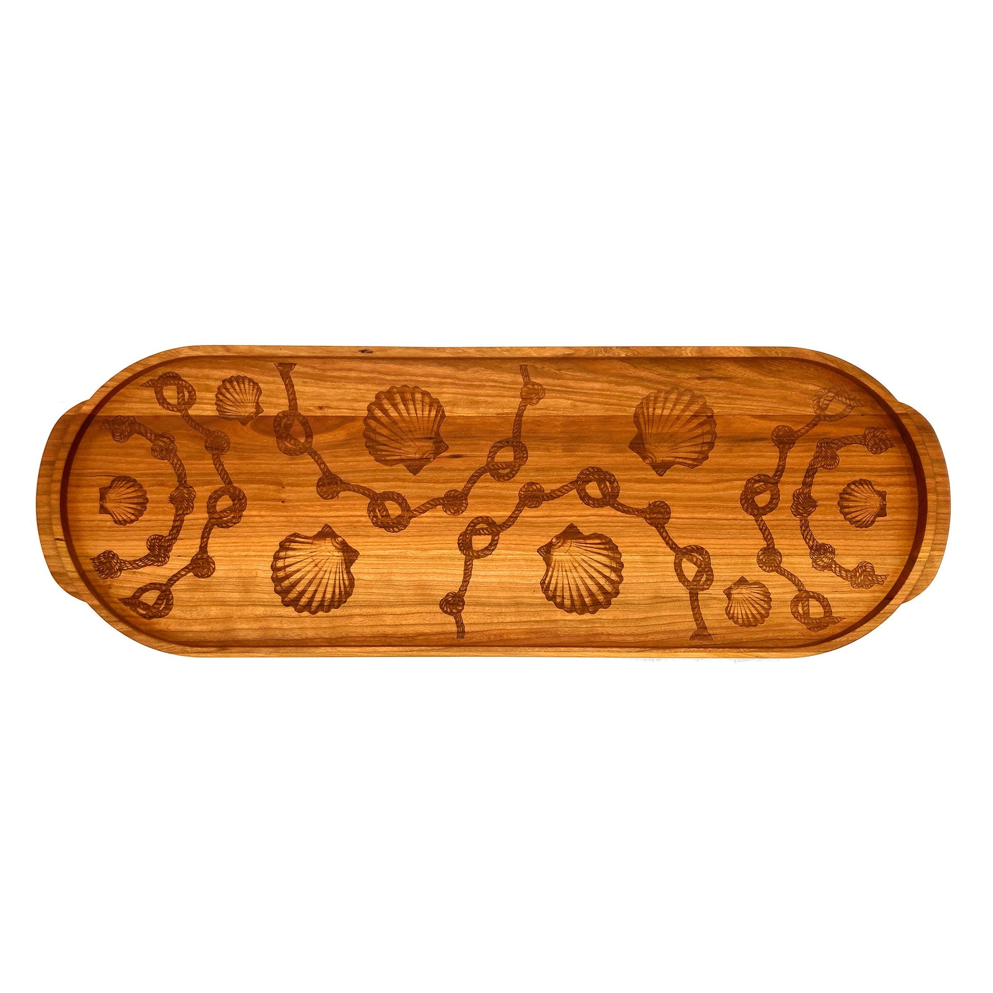 A showstopping serving tray expertly crafted from cherry wood. The large oval serving tray has been engraved with the artwork from Vermont Artisan Laura Zindel. Create a talk of the party charcuterie board for your next event.