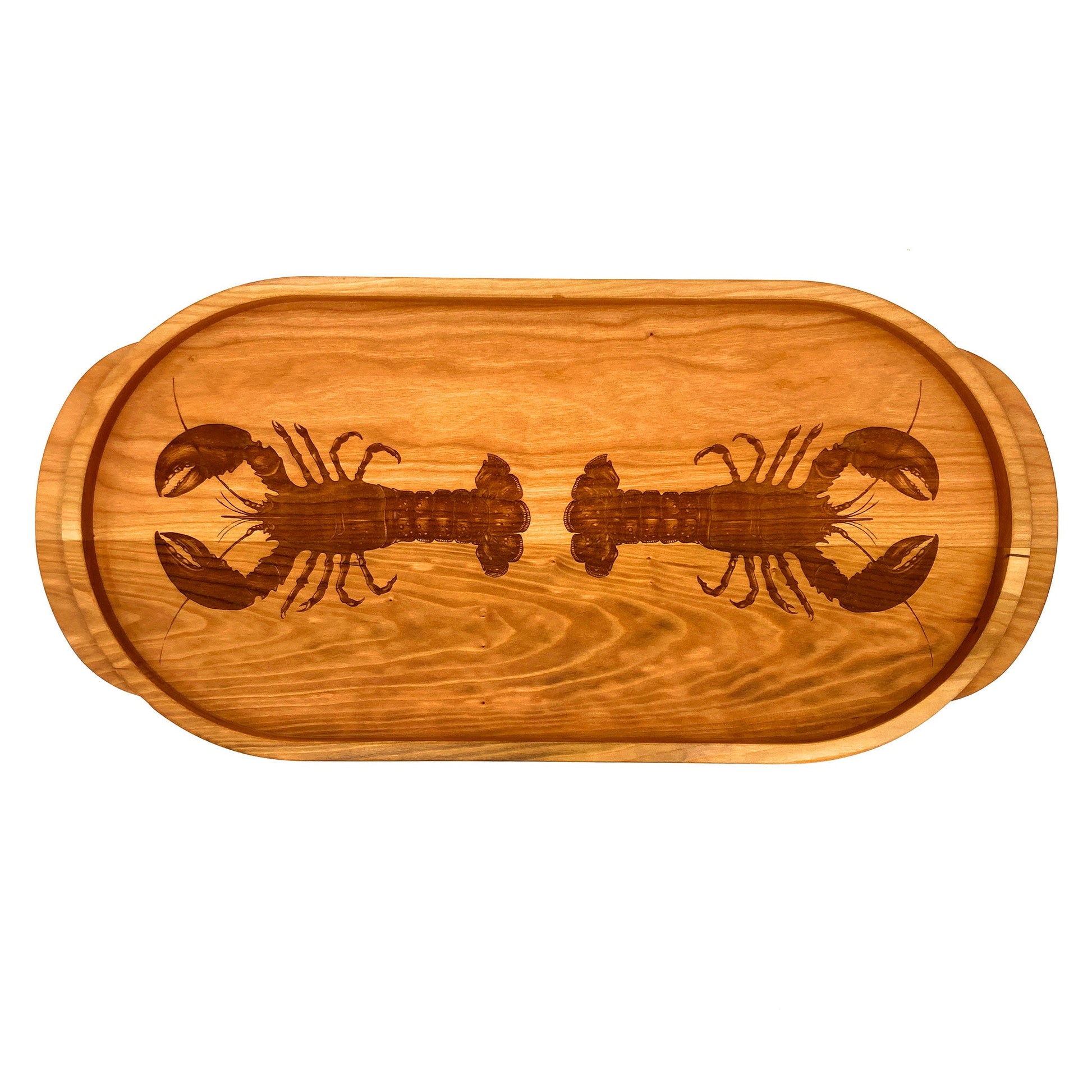 Our Cherry Oval Wooden Tray has been engraved with lobsters, from the artwork of Vermont Artist, Laura Zindel. This tray has a rimmed edge and integrated handles making it ideal for serving. A great tray for serving drinks on the dock or sharing your favorite lobster rolls for your next celebration.