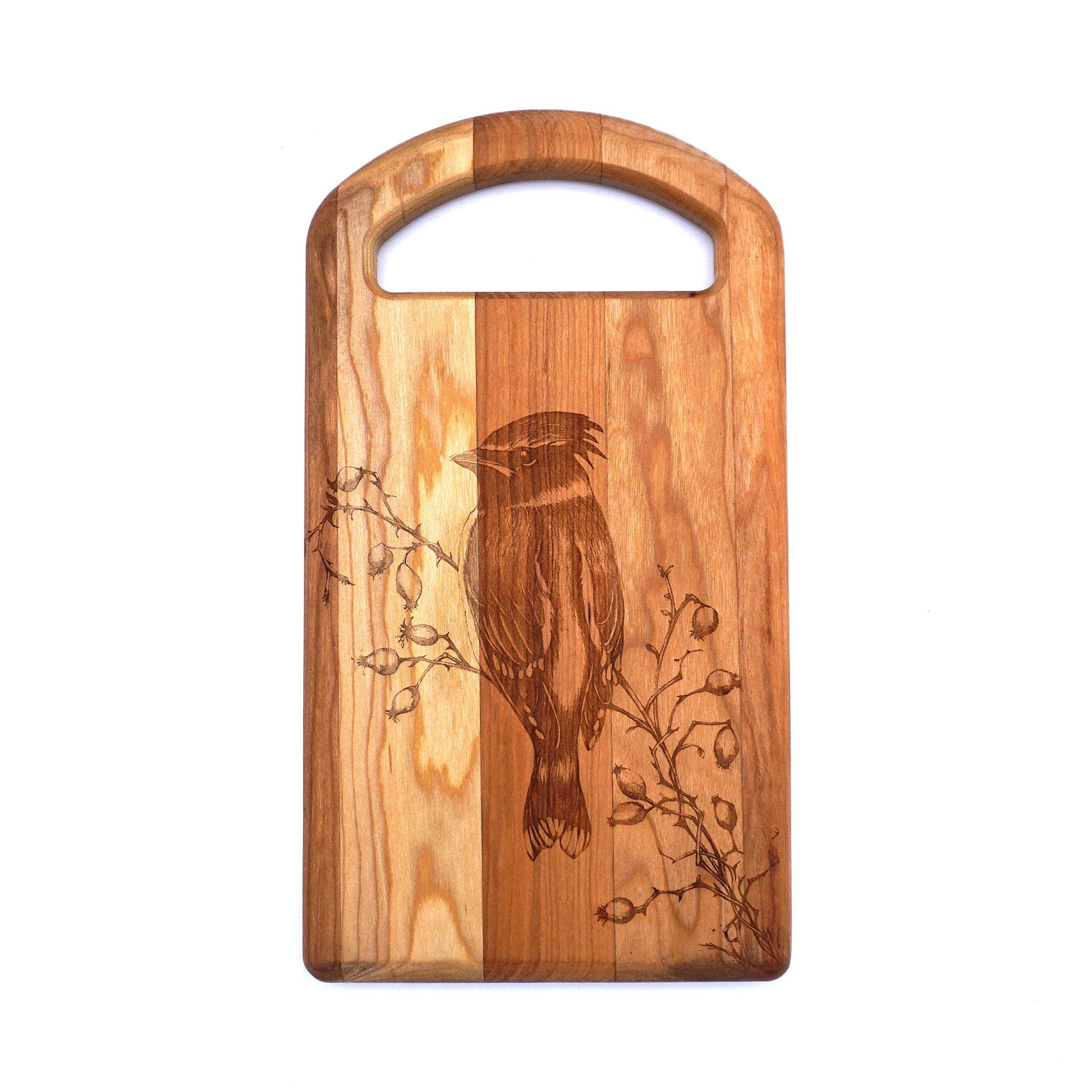 Our Small Cherry Wooden Serving Board has an oval handle that is both beautiful and comfortable. The size of the board works well as a bar board, a cheese board for two or an individual tapas plate. The artwork, of North American birds, celebrates the natural world. All of the artwork is from Vermont Artist, Laura Zindel.