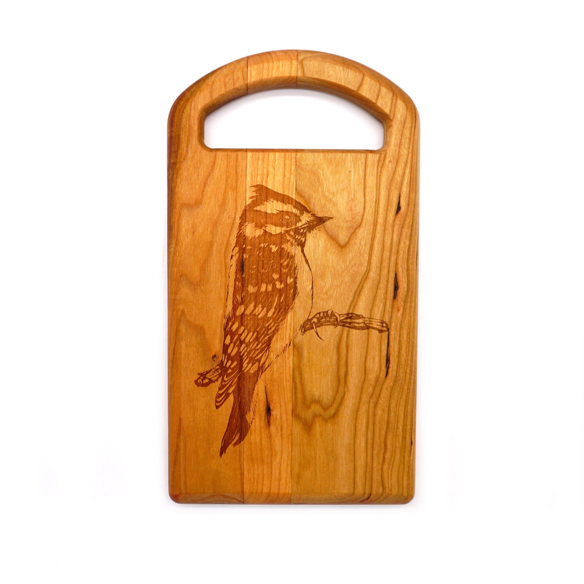 Our Small Cherry Wooden Serving Board has an oval handle that is both beautiful and comfortable. The size of the board works well as a bar board, a cheese board for two or an individual tapas plate. The artwork, of North American birds, celebrates the natural world. All of the artwork is from Vermont Artist, Laura Zindel.