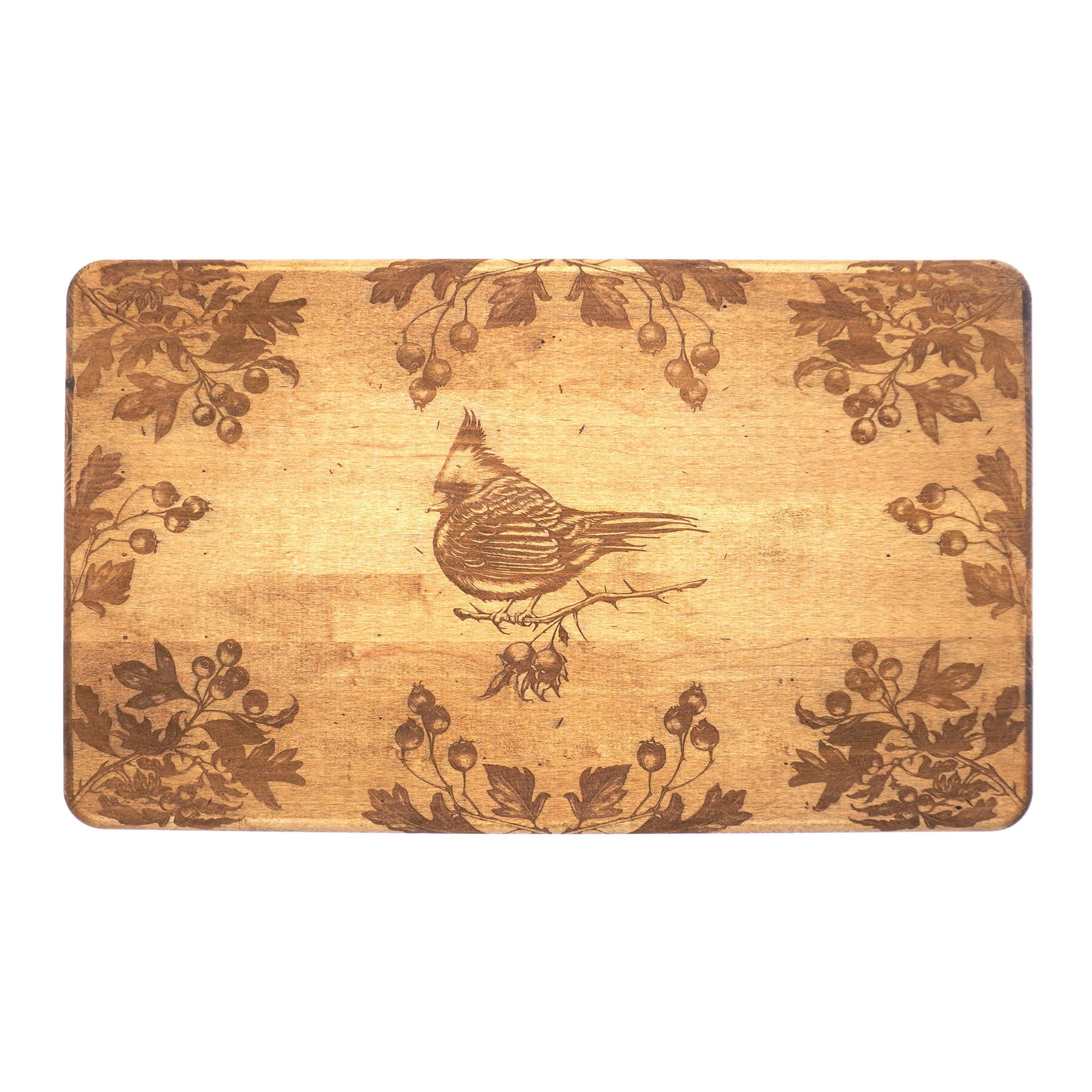 Our Maple Artisan Serving Board has a been engraved with a cardinal and is surrounded by winter berries. The artwork is from Vermont Artisan Laura Zindel. Build a stunning charcuterie board for your next party.