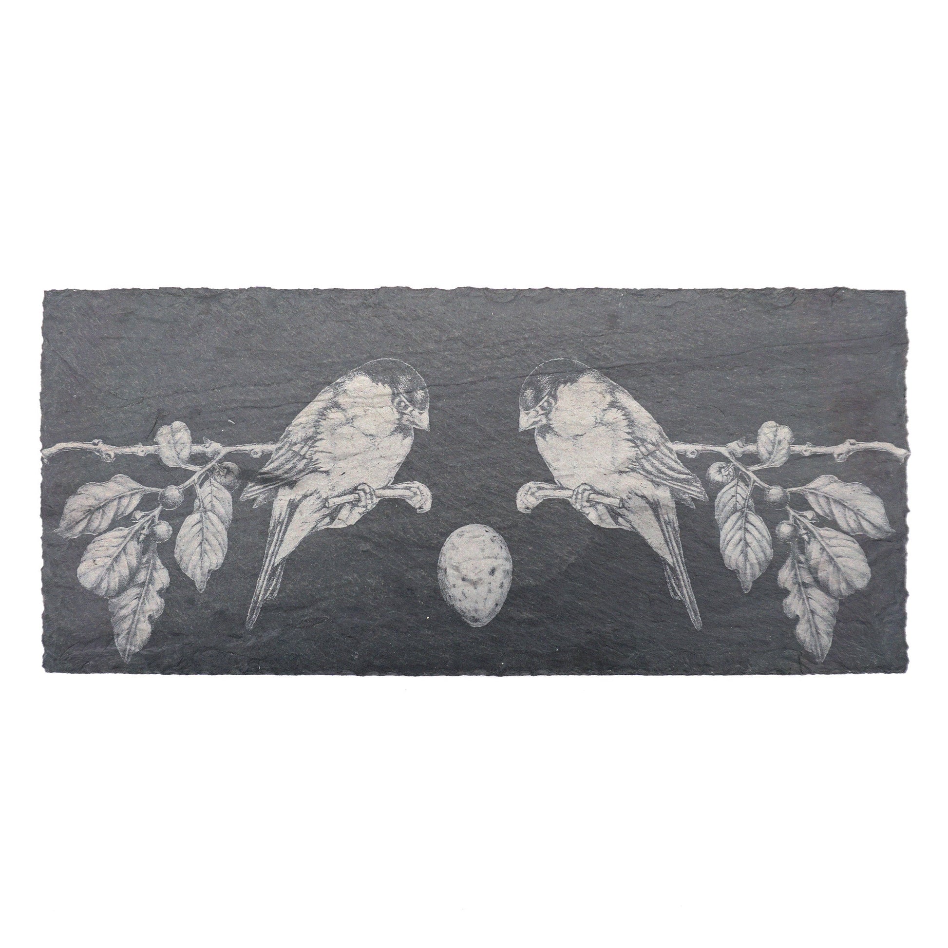 Our small rectangle slate has been engraved with artwork from Vermont Artist Laura Zindel. The engraved image is of two chickadees. This simple board is a unique way to serve your favorite appetizers or to create a small cheese board. Slate can be used as a trivet for a hot dish.