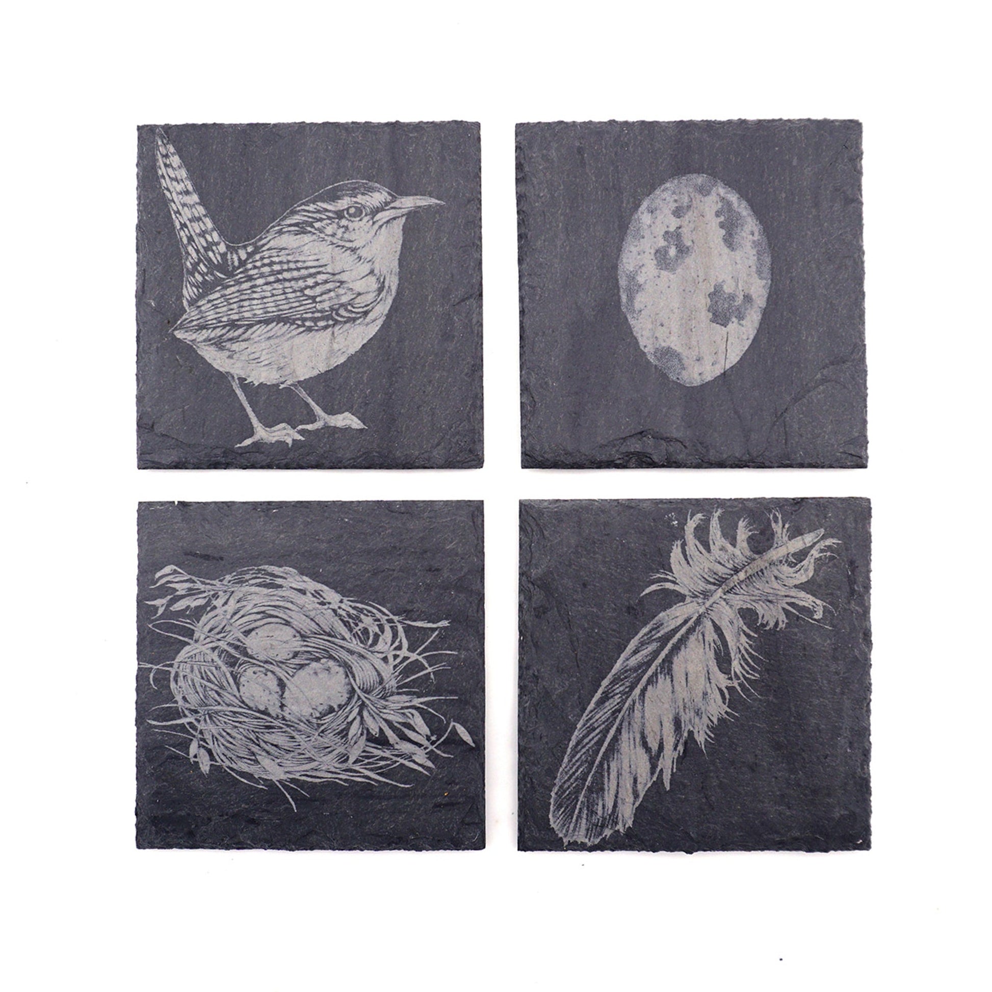 Our Slate Coasters are a set of 4 coasters with cork feet. The slate has the natural layered edge of slate. They are engraved with the artwork of Vermont Artist, Laura Zindel. The designs include a wren, egg, nest and feather.