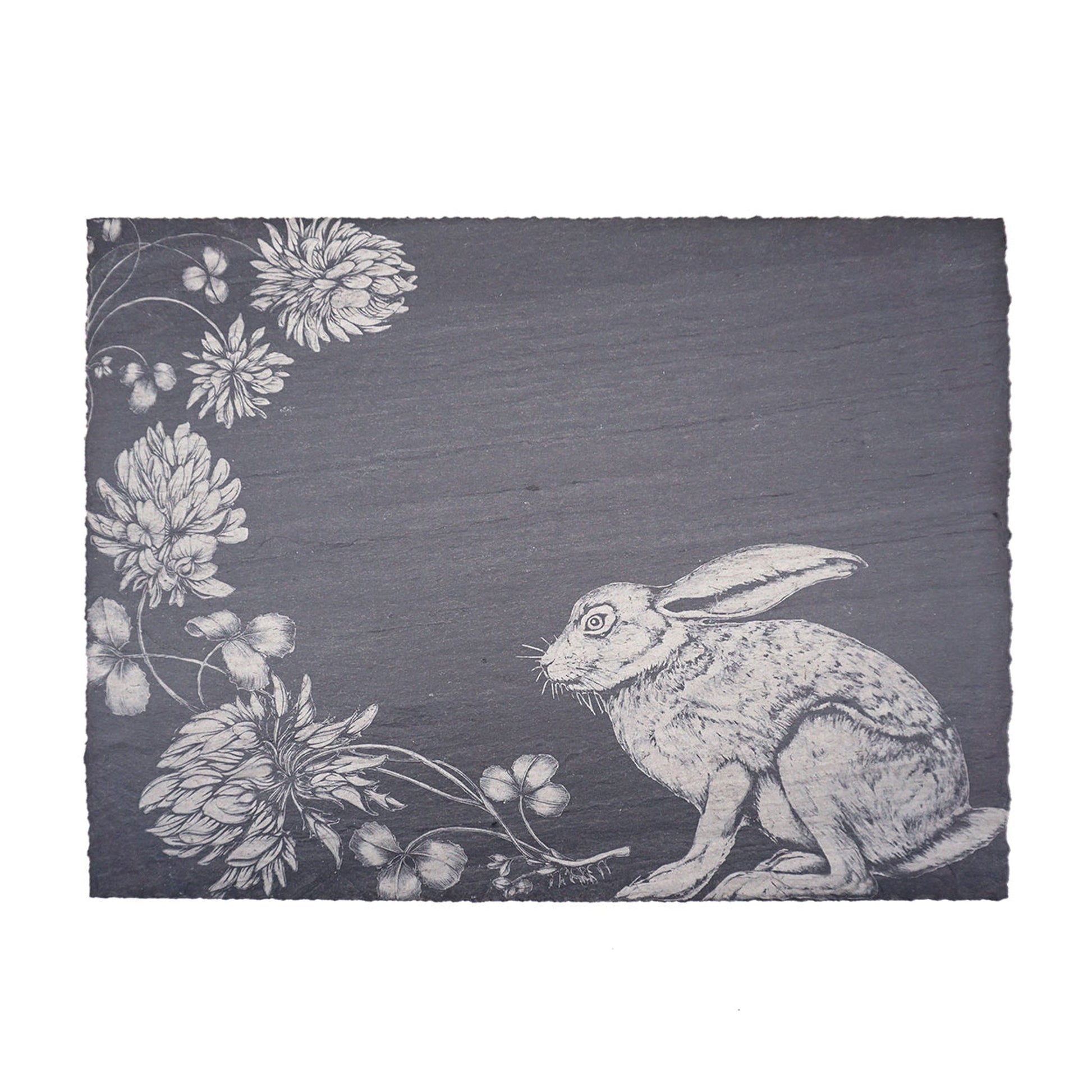 Our Slate Rectangle Serving Tray has been engraved with a hare and clover to celebrate the start of spring. The artwork is from local Vermont Artisan, Laura Zindel. The slate tray can be used for building a stunning cheese board or can also be used as a trivet for a hot dish.