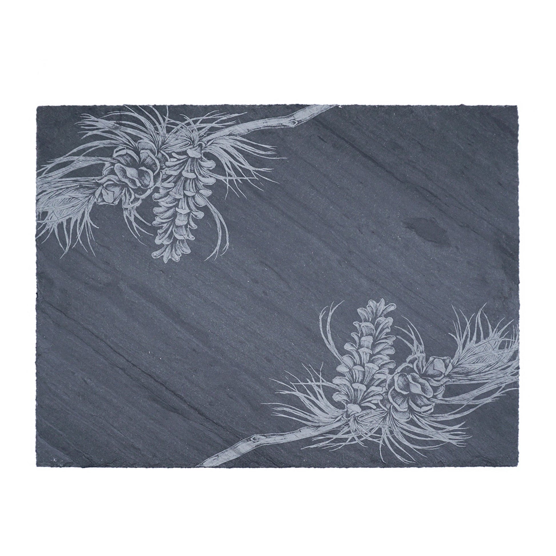 Our Slate Rectangle Serving Tray has been engraved with pine boughs from the artwork of Vermont Artist Laura Zindel. The slate tray can be used for building a stunning cheese board or can also be used as a trivet for a hot dish.