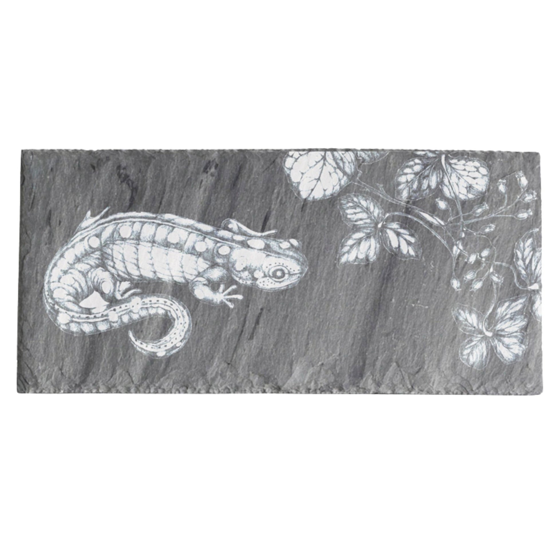Our small rectangle slate has been engraved with a spotted salamander. The artwork is from Vermont Artist, Laura Zindel. The slate serving tray can be used to serve appetizers, desserts or cheeses.