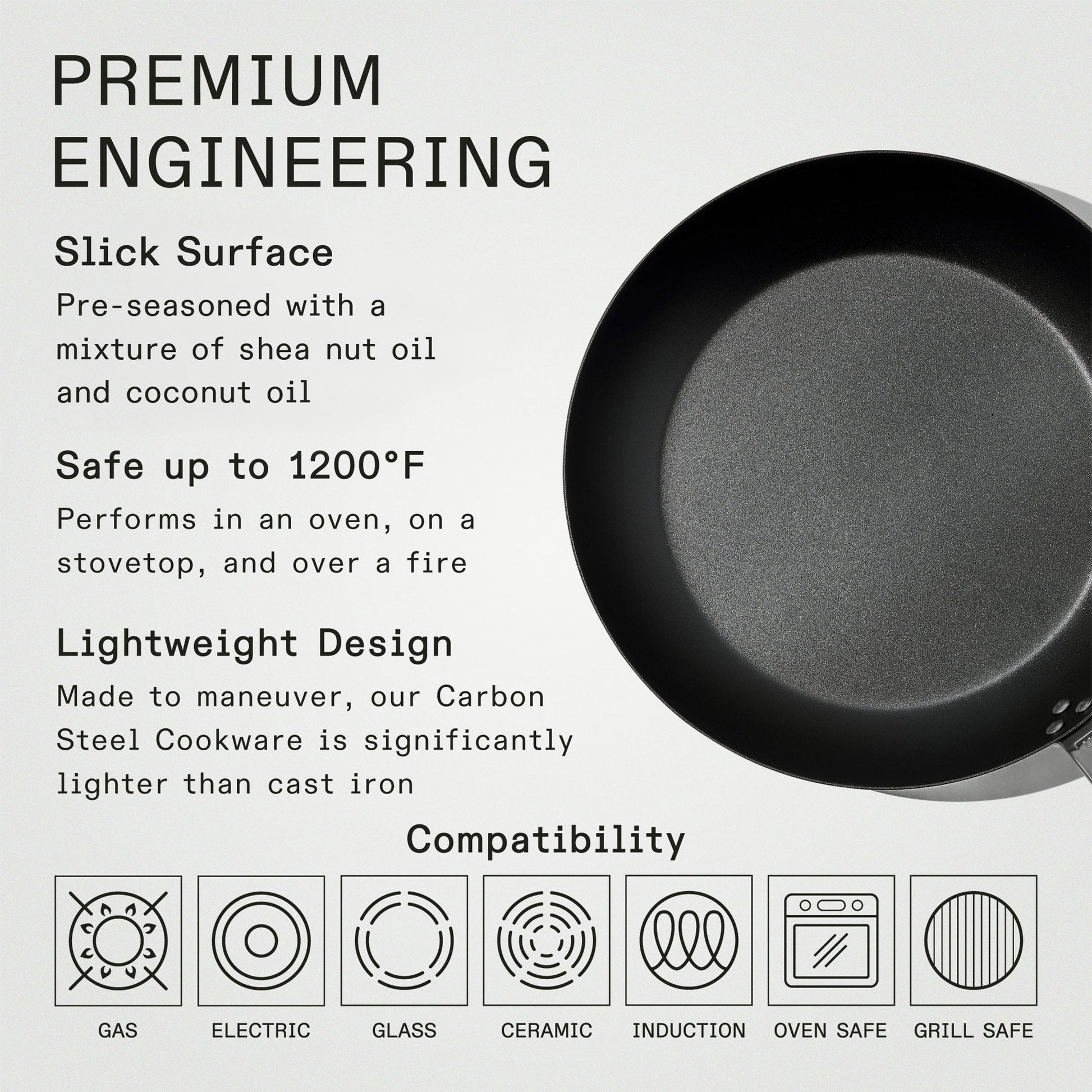 They stamp Carbon Steel into a thin disc that’s half the weight of cast iron but every bit as durable—so it seasons faster, responds quicker, and is rugged enough for your grill or open flame.