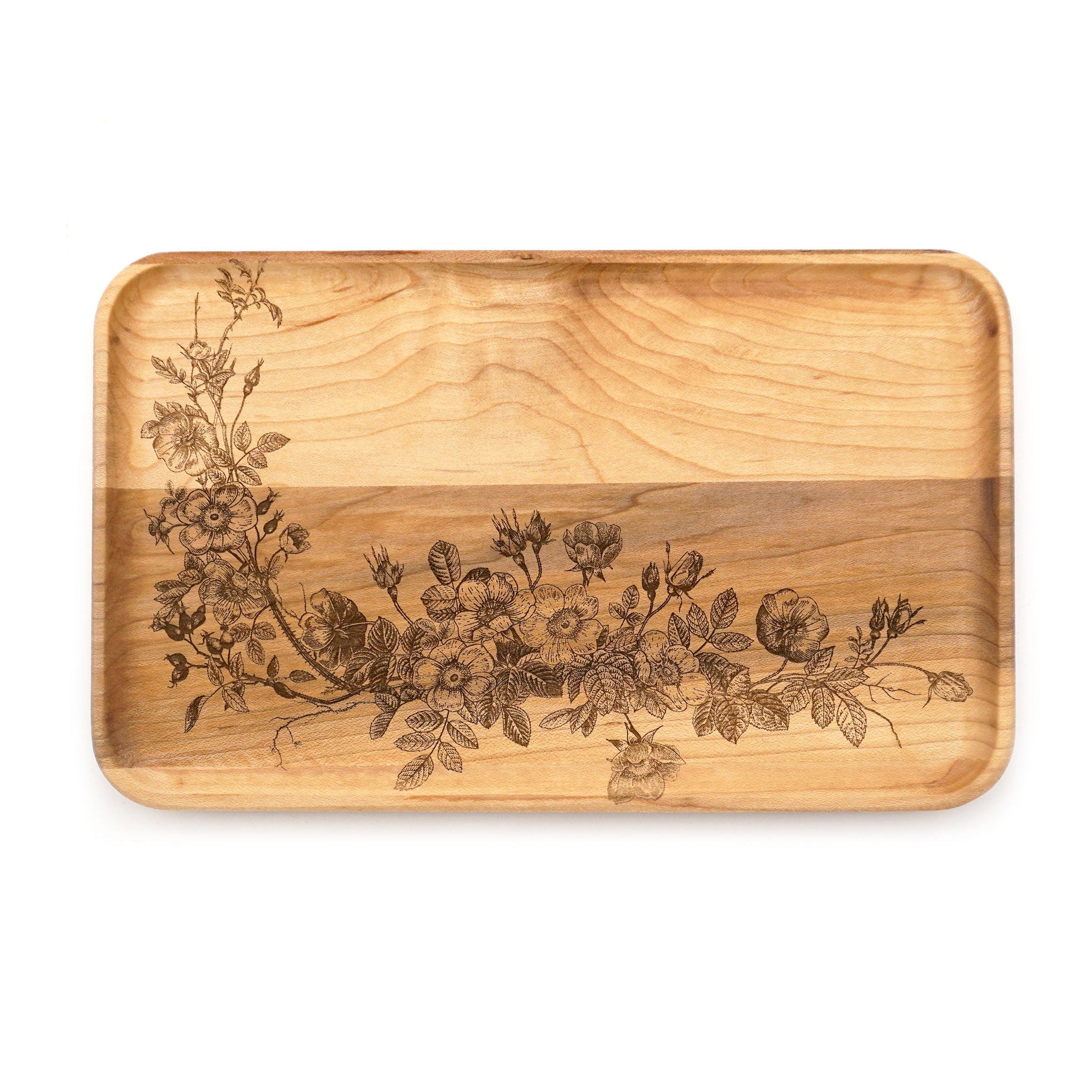 This maple appetizer plate, featuring engraved wild roses, is a unique and elegant addition to your tablescape. Handcrafted from the finest maple wood, it adds a touch of nature and sophistication to any occasion. Perfect for serving hors d'oeuvres or displaying small desserts, this plate is a must-have for any party or gathering.