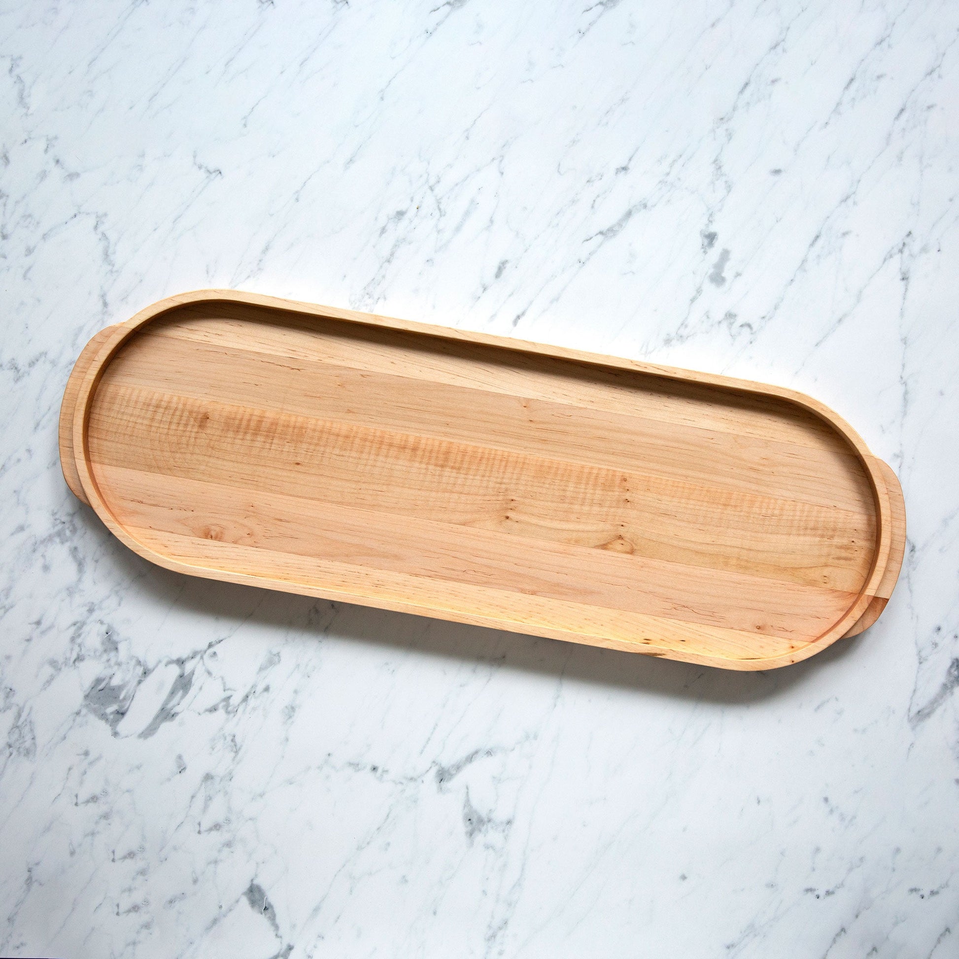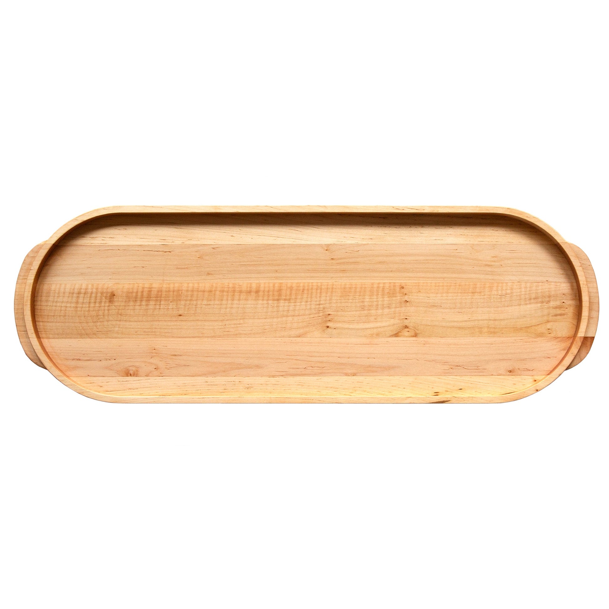 Enjoy a wooden buffet experience with this classic Maple Oval Wooden Buffet Serving Tray. Constructed from a single piece of maple wood and measuring 36" x 12" x 1.25", this serving tray is perfect for entertaining guests or family gatherings. Its sleek design makes it perfect for serving grazing boards, craft cocktails, and more.