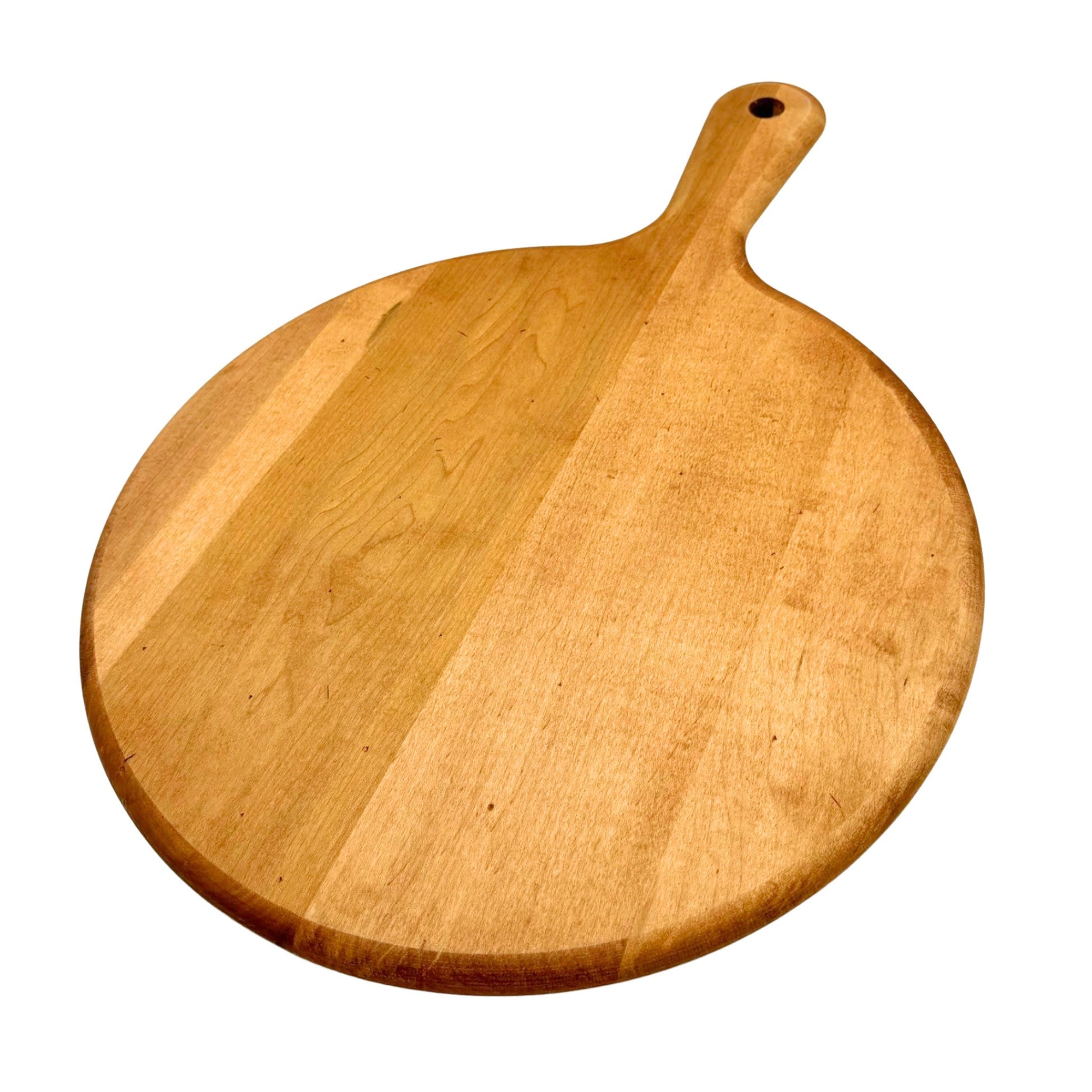 Crafted by our skilled artisans, our Maple Round Handled Board is a must-have for your next party. Made from high-quality maple wood, this 20" x 14" board is perfect for displaying charcuterie or serving piping hot pizza. Its elegant round handle adds a touch of sophistication to any occasion.