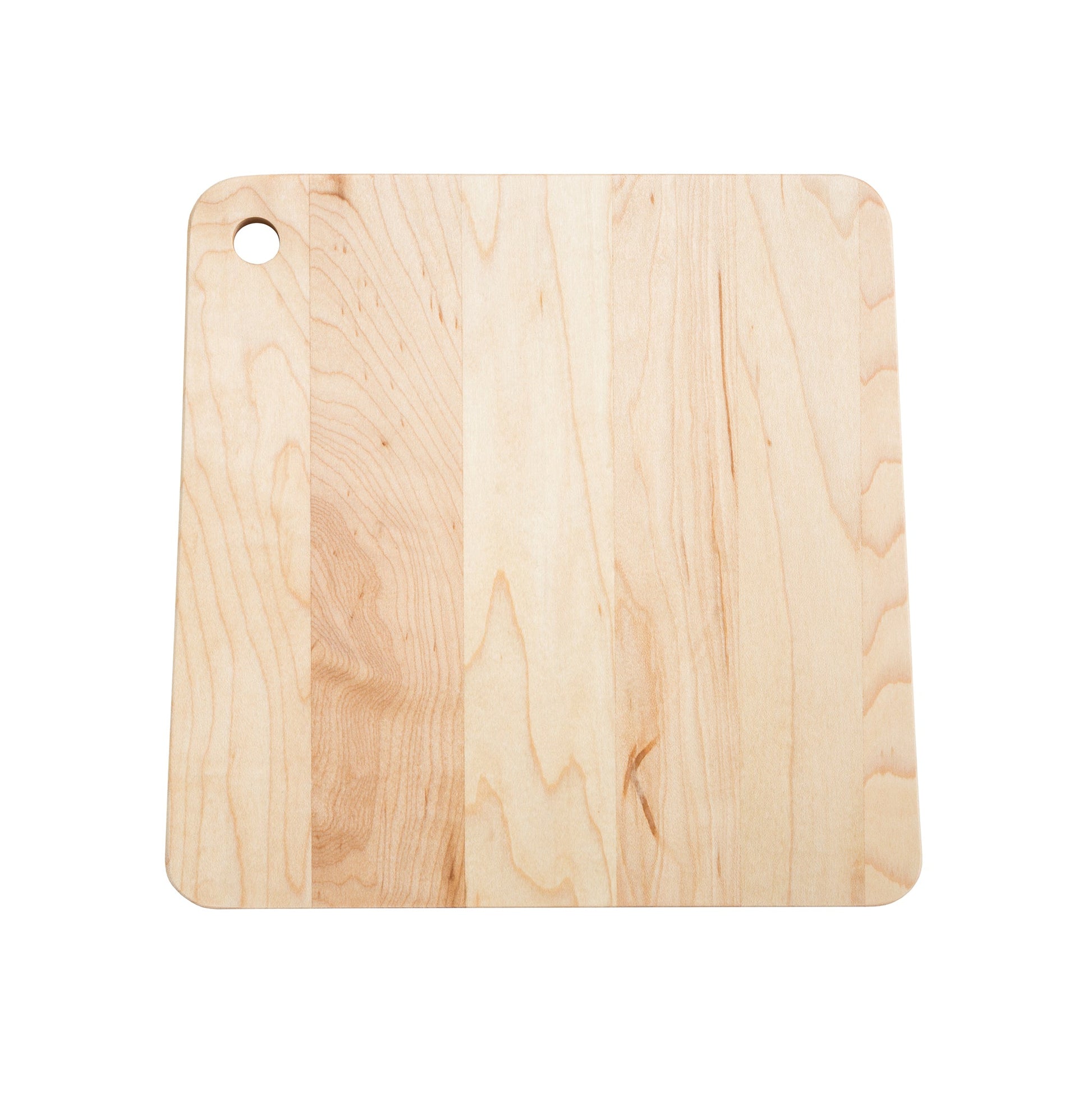 This small maple cheese board is the perfect size for a single cheese or a quick appetizer for two. This board is not an exact square. The board is just a bit smaller at the top edge with the hole.