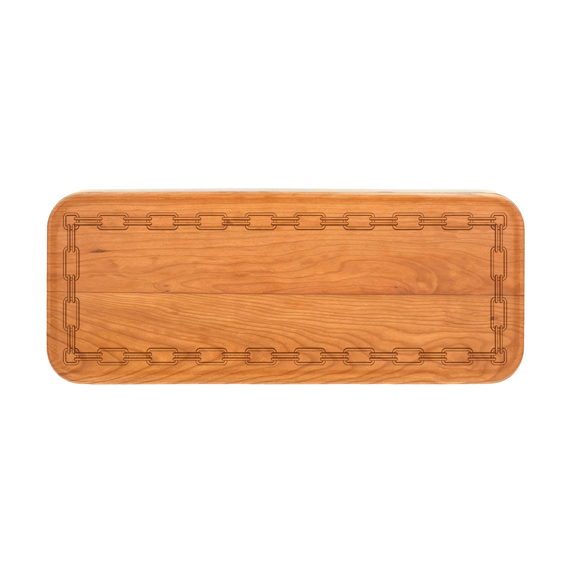 Designed by acclaimed architect Ramsay Gourd, this cherry wood appetizer plate features an intricate link pattern carved along its border. The refined geometry and premium wood grain create a sophisticated serving vessel that commands attention on any table. Perfect for entertaining with intention—a piece that speaks to those who appreciate architectural precision and artisanal woodcraft.