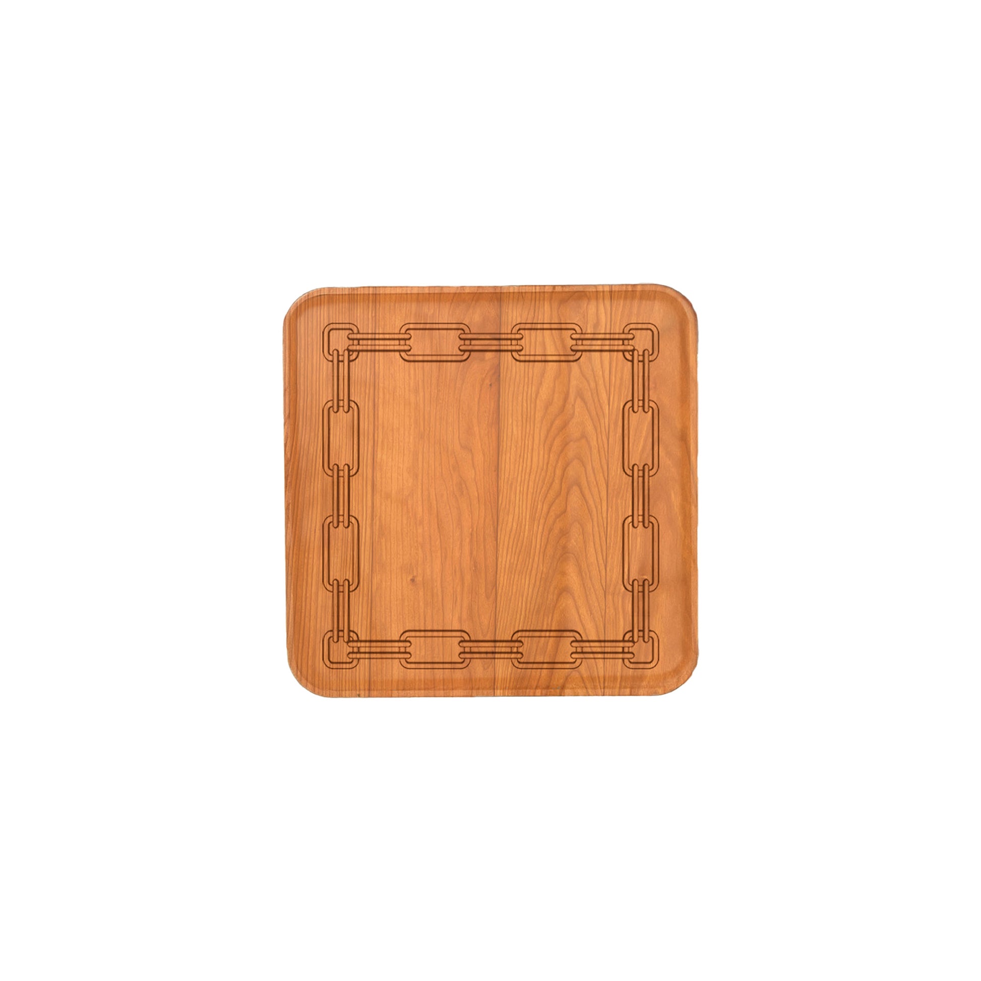 This handcrafted square appetizer plate showcases premium cherry wood paired with Ramsay Gourd's distinctive link motif that gracefully frames the perimeter. A collaboration between artisan woodworking and architectural design, it elevates everyday entertaining with refined aesthetics and functional elegance.