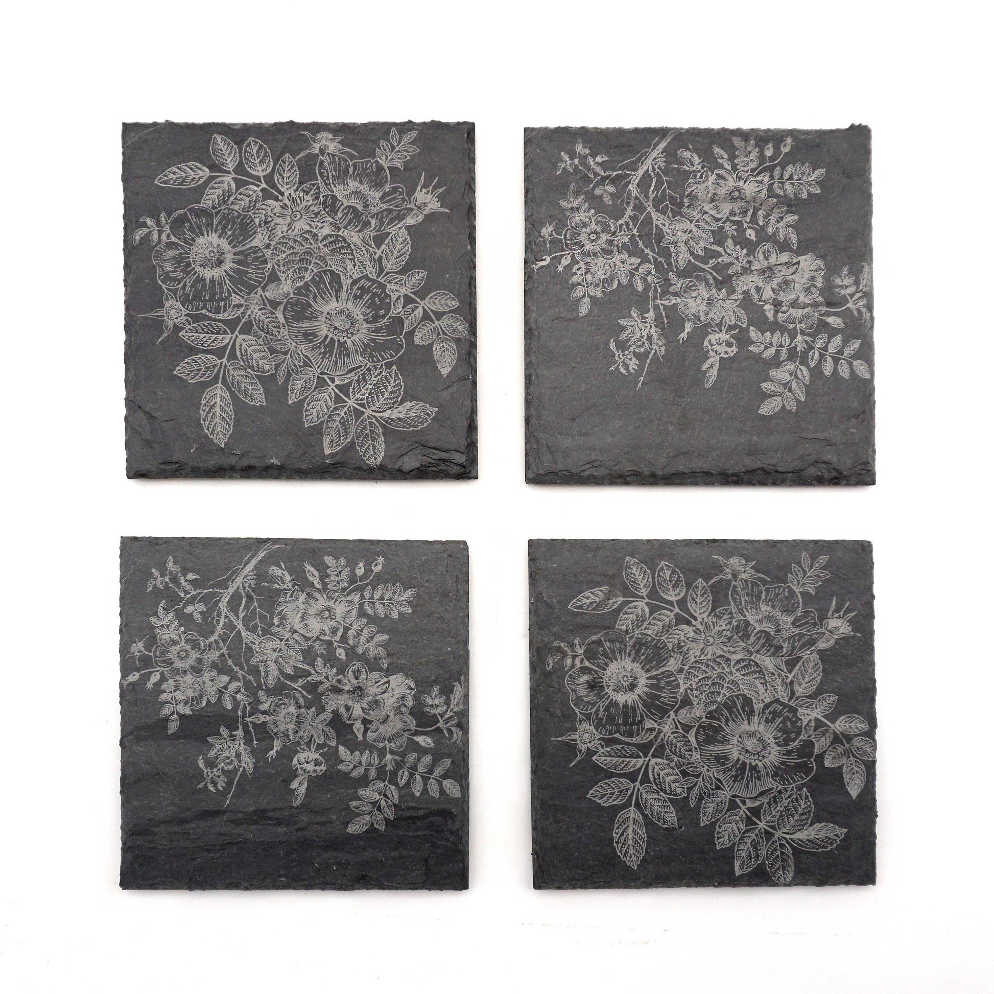 Expertly crafted from sleek and durable slate, these coasters will add a touch of elegance to your home. Each set includes four coasters, each one displaying a different engraved design of beautiful wild roses. Protect your surfaces in style, while enjoying the benefits of a high-quality, long-lasting product.