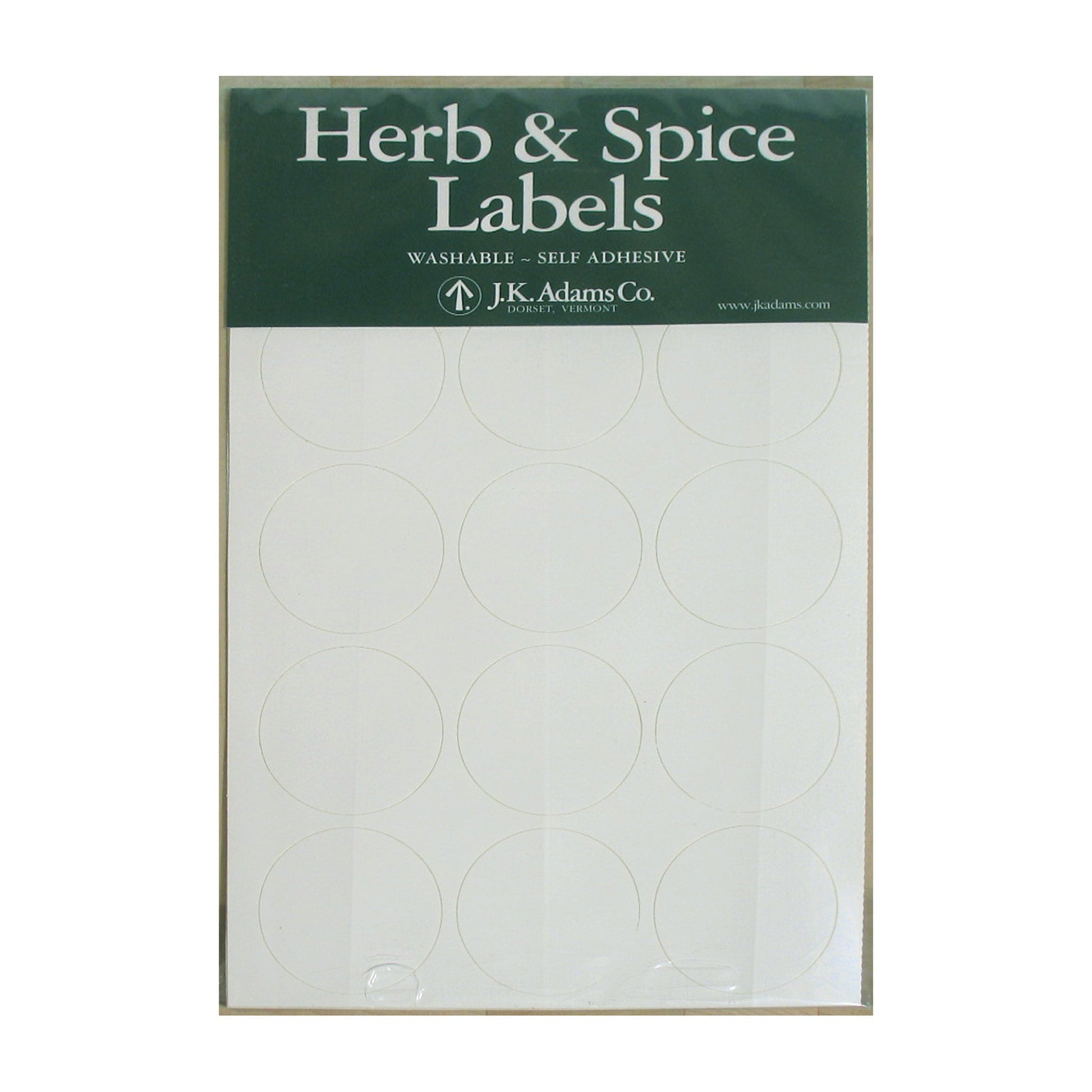 Self-adhesive round labels for our JK Adams spice bottles. The labels fit on the lid so that your spices are easy to pick out. Labels are available in a package of 30 blank labels.