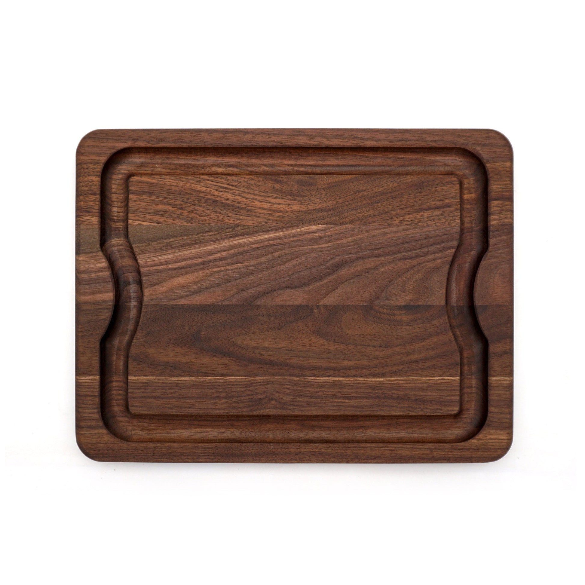 A walnut bbq carving board, 16" x 12", is the perfect size for cooking for 1-2 people. The board is in deep rich walnut. There is a juice groove and undercut handles.