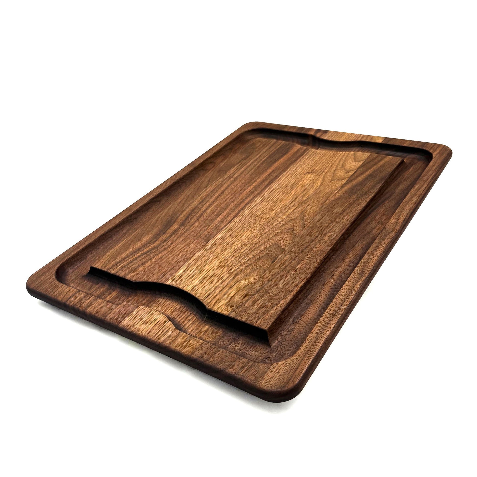 Our walnut cutting board can be engraved or carved to create a personalized cutting board. Our walnut board is made for going out to the BBQ or bringing your roast to the family table. The undercut handles make carrying an ease. There is a flat surface which is perfect for carving your favorite fall-of-the-bone ribs and grilled steaks. A wide groove collects the juices while you carve keeping your counters and table nice and tidy.